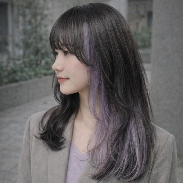 落ち着いたダークトーンをベースに、内側から毛先へ淡いパープルを重ねたアンブレラカラーのロングです。