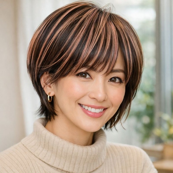表面にやわらかな明るさを重ね、内側は落ち着いたトーンを残すことで、白髪と染めた髪の差を自然にぼかしています。コントラストを強く出しすぎないため、派手にならず、上品さを保てるのが特徴です。カットはトップに丸みを持たせ、サイドと襟足は締めることで、頭の形がきれいに見えるバランスに。表面に光が集まることでツヤ感が増し、髪が細くなりやすい年代でもふんわりした印象に仕上がります。伸びてきても境目が目立ちにくく、カラー周期を延ばしやすい点も現実的なメリットです。白髪を隠すのではなく、なじませながらきれいに見せたい40代におすすめの大人ショートです。