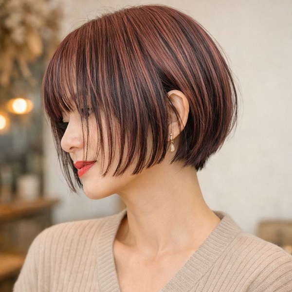 ベースは落ち着いた深みのある色味を残し、表面にほんのり明るさを重ねることで、白髪と染めた部分の境目を自然にぼかしています。赤みを含んだニュアンスカラーを使うことで、髪にツヤが出やすく、顔色まで明るく見えるのが特徴です。カットはあごラインを軸に、毛先をそろえすぎず厚みを残すことで、髪が細くなりやすい年代でもまとまりをキープ。横顔に丸みが出るため、きつく見えず上品な印象に仕上がります。伸びてきても白髪が目立ちにくく、日常の扱いやすさも考えた大人世代向けのショートです。
