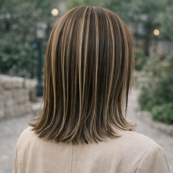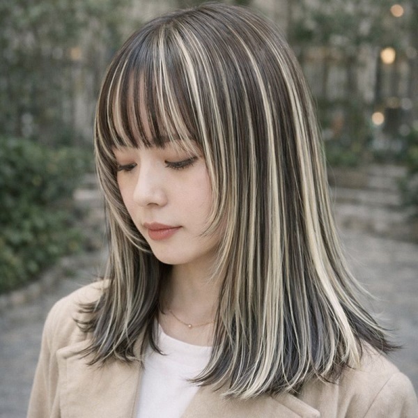 ベースは深みのあるアッシュブラウンで落ち着かせ、表面に細く明るいラインを重ねることで、白髪とのコントラストを自然にぼかしています。筋感を縦方向に入れることで、髪の動きに合わせて明るさがなじみ、派手さを感じさせません。カットは鎖骨下の長さを活かし、毛先に軽さを出すことで重く見えがちな年代の悩みをカバー。表面に光が集まるためツヤ感が出やすく、伸びても白髪が目立ちにくいのが特徴です。白髪を無理に隠さず、大人の余裕として取り入れたい40代に向いたアンブレラスタイルです。