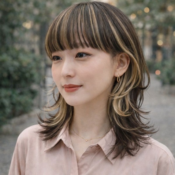 白髪が出やすい表面や分け目を自然にぼかしながら、個性と洗練を両立させたアンブレラカラーのウルフスタイルです。ベースは深みのあるブラウンで落ち着かせ、表面と顔まわりに明るさを重ねることで、白髪との色差をやわらかくなじませています。筋感をランダムに入れることで、動くたびに陰影が生まれ、単調になりやすい40代の髪に立体感をプラス。カットはトップに丸みを残しつつ、毛先に軽さを出すことで、シャープすぎず大人らしいバランスに整えています。髪が細くなりやすい年代でもボリューム感を出しやすく、伸びても白髪が目立ちにくいのが特徴。甘さに寄りすぎない、大人のためのアンブレラスタイルです。