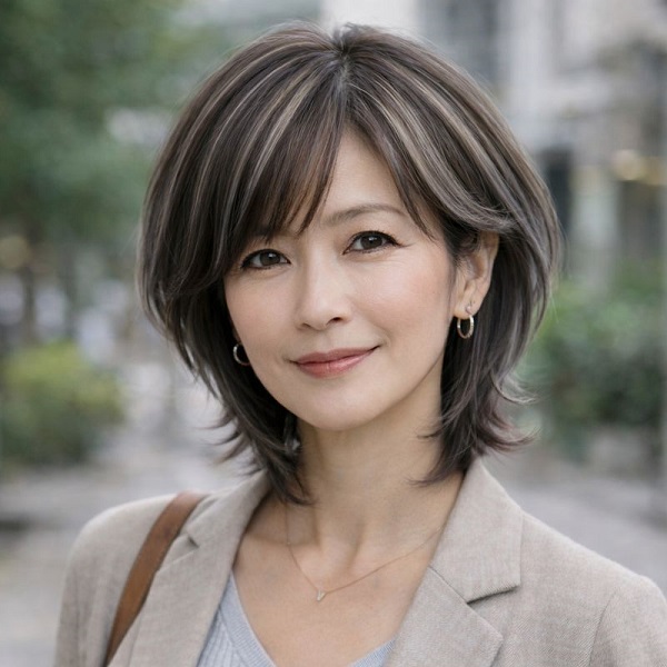 白髪を隠すのではなく、日常の中で自然に溶け込ませたい50代に向いた、大人のためのアンブレラスタイルです。