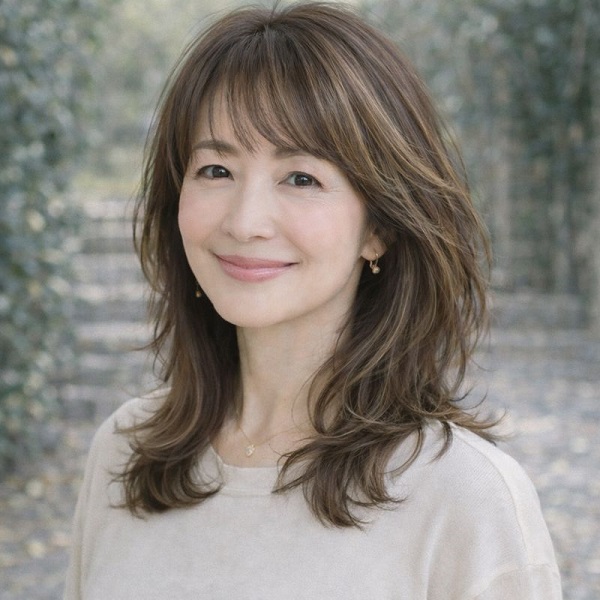 カットは肩下の長さを活かしたレイヤーで、表面に自然な動きが出るため、髪が細くなりやすい年代でもふんわり見えやすく、手ざわりもなめらかに感じられます。