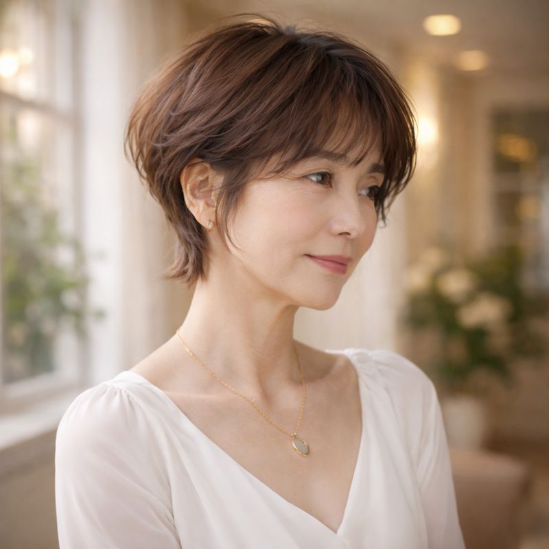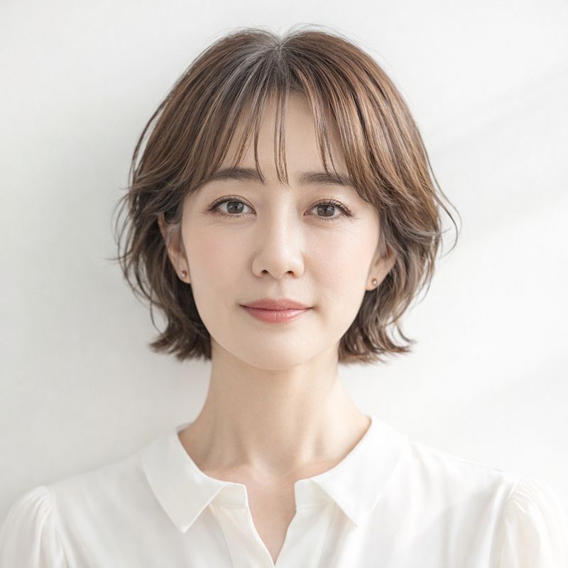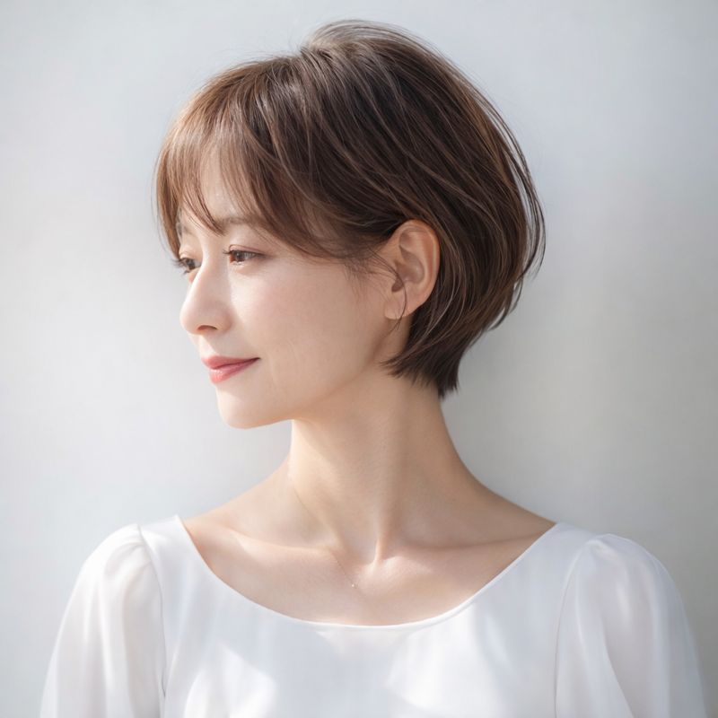 例えば、トップにふんわりとボリュームを持たせたショートヘアは、顔立ちを明るく見せ、若々しい印象を与えます。また、顔周りに動きを加えたレイヤーボブは、フェイスラインを引き締め、エレガントな雰囲気を演出します。