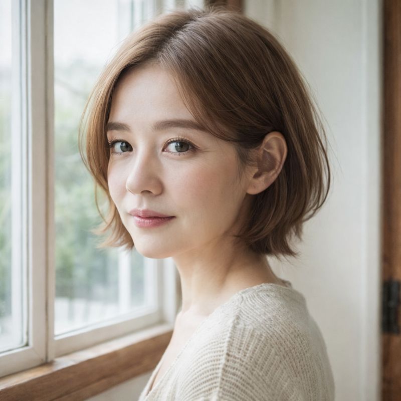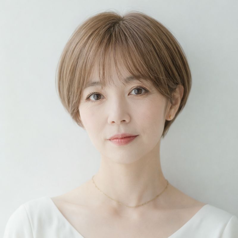 面長を美しく見せる丸みのあるショートヘアもおすすめ。カットは、ひし形の美しいシルエットを生み出すために、レイヤーを控えめに入れ、全体に丸みを帯びさせます。ベージュのカラーリングで髪に柔らかさと透明感を加え、穏やかな印象を演出します。