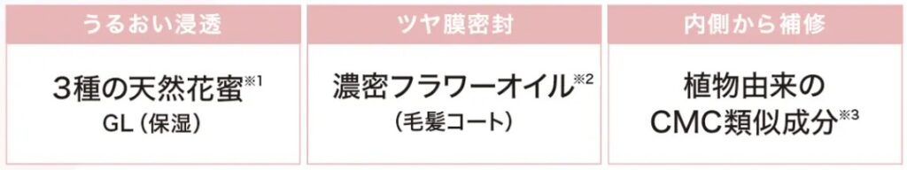 3種の天然花蜜を配合し、髪にうるおいを与えながらツヤを引き出す設計になっています。日々のケアでパサつきや広がりを改善したい人に向いた仕上がりです。