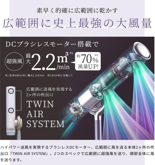 DCブラシレスモーター採用で、シリーズ史上最大風量を実現しており、速乾性のアップ&静音化という使い勝手が改善されています。