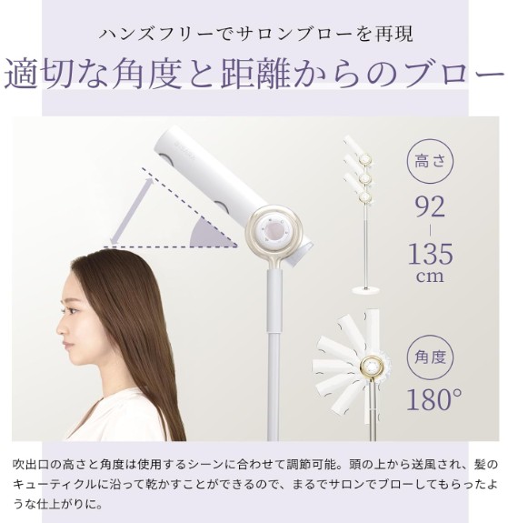 “両手フリー”で乾かせるスタンド型構造により、ブラシやコームを手に持ってブローしながら使用でき、仕上がりの精度が上がる効果があります。