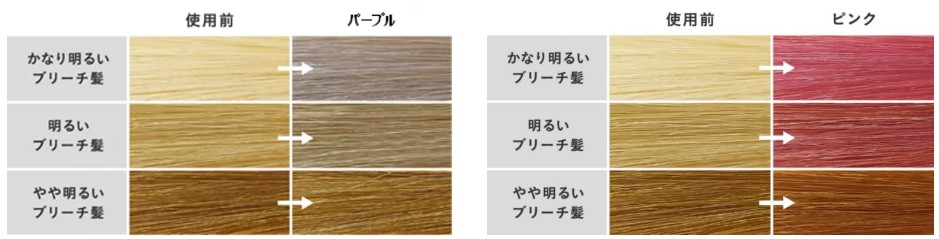 | カラー展開 | パープル:ブリーチ後の黄みが気になる髪に透明感をキープするカラー ピンク:暖色系カラーの色味をキープするカラー |