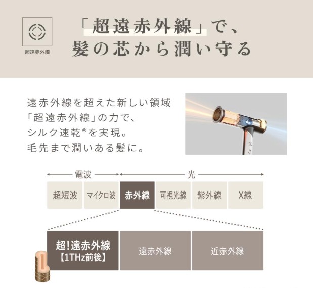 さらに、超遠赤外線によって髪内部の水分を保ちながら乾かせるので、パサつきやすい髪・ダメージ毛でもしっとりしやすい仕上がりが期待できます。