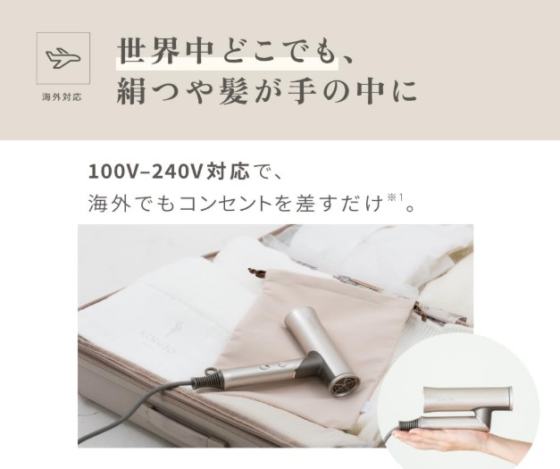 KINUJOのヘアドライヤー「Voyage」です。Voyage(遠くへ旅する人)という名前の通り、海外に持っていけることを意識したドライヤーですね。