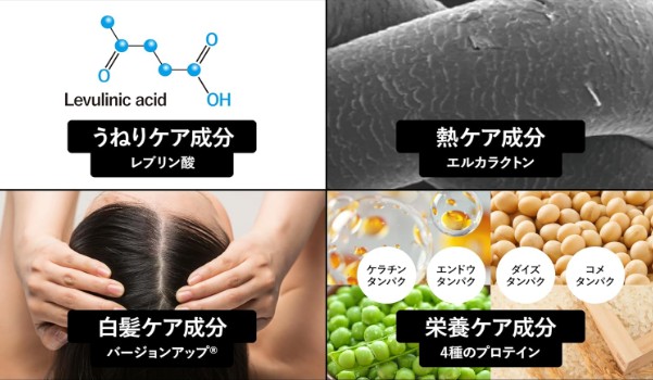 髪の“うねり”を抑えるレブリン酸、ドライヤーなどの熱と反応して働くエルカラクトン、そして髪の90%を占めるタンパク質を補給するという4種のプロテインが配合されています。