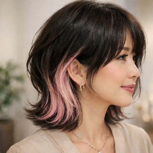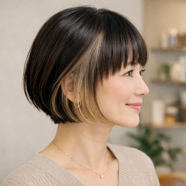 特にボブスタイルとの相性は抜群。表面は落ち着いたカラーで上品に仕上げ、内側にアクセントカラーを入れることで、動きのある立体感が生まれます。