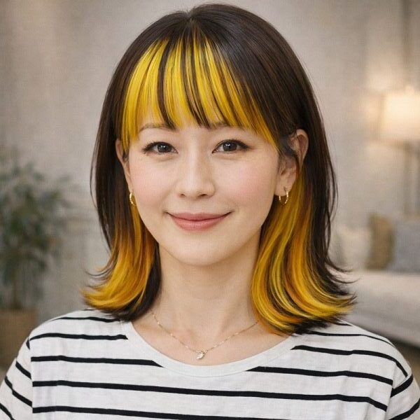 表面を深みのあるダークブラウンでまとめ、内側と前髪の一部にイエロー~オレンジの明るさを仕込んだ逆アンブレラカラーです。