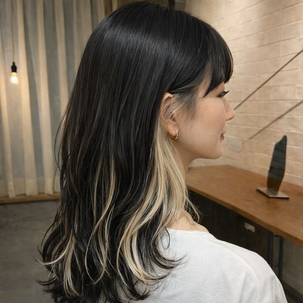 髪を巻いたときやかき上げたときにさりげなく色が見えるため、派手すぎず上品な華やかさを演出できます。また、伸びてもプリンが目立ちにくく、カラーの持ちが良いのも嬉しいポイントです。
