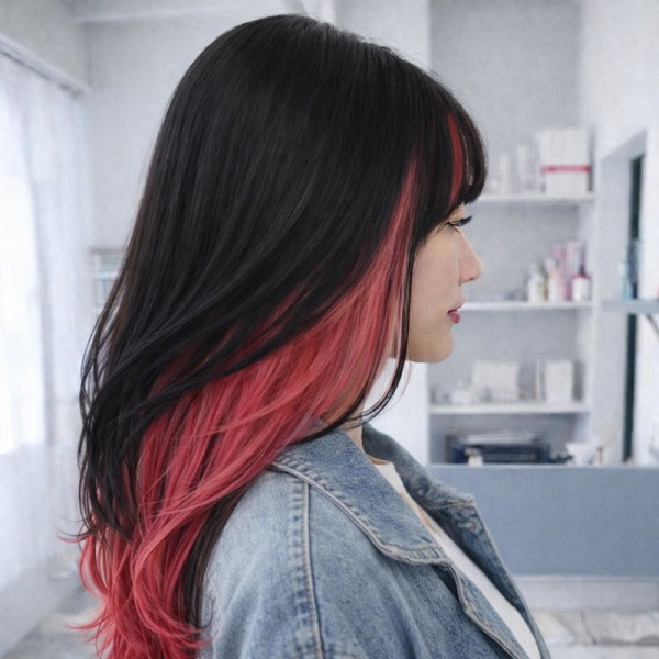表面を深みのある黒髪でまとめ、内側から毛先にかけて赤みを効かせた逆アンブレラカラーのロングです。
