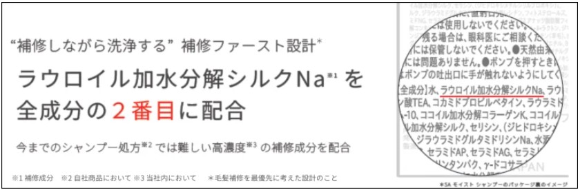 「全成分表示の2番目に、高価な補修成分が来ている……」これ、美容業界の人間が見ると、思わず二度見してしまうレベルの贅沢処方なんです。一般的なシャンプーは、水の次に洗浄成分(界面活性剤)が来ますが、このSA モイストは、なんと高級補修成分である「シルクPPT(ラウロイル加水分解シルクNa)」が2番目に表示されています。