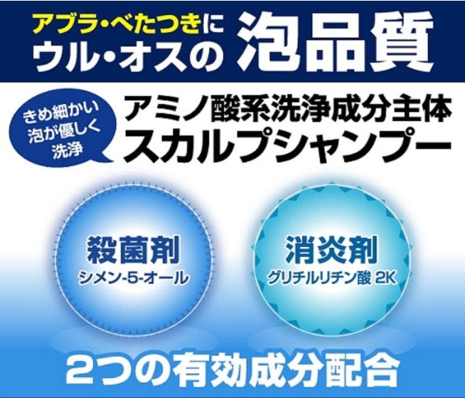 ウルオス 薬用スカルプシャンプーは大塚製薬が展開する医薬部外品の頭皮ケアシャンプーで、シメン-5-オール(殺菌剤)とグリチルリチン酸2K(消炎剤)という2つの有効成分を配合しています。